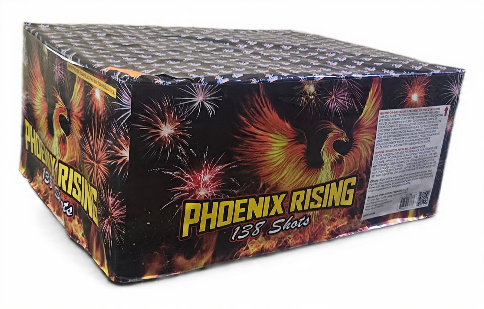 Phoenix Rising 138 shot cake is a square shape cake pyro.Shoots in the sky with big bomb bangs, dazzling colour, patterns and stars.